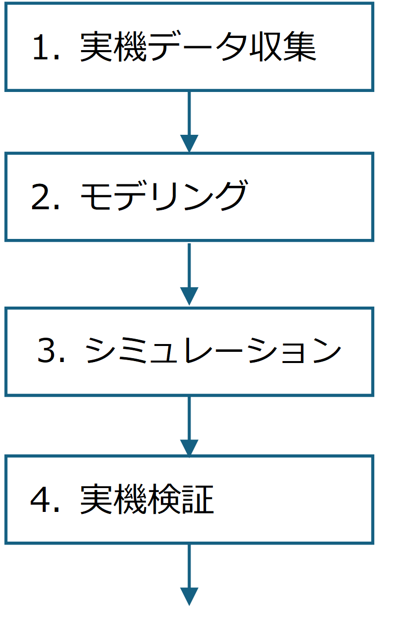 シミュレーションを利用するには、制御対象のモデルが必要です。当サービスでは、実験データに基づいて対象モデルを作成します(モデリング)。シミュレーション上で大まかなパラメータ調整を行った後、実機にて最終的な確認・調整を行ってください。