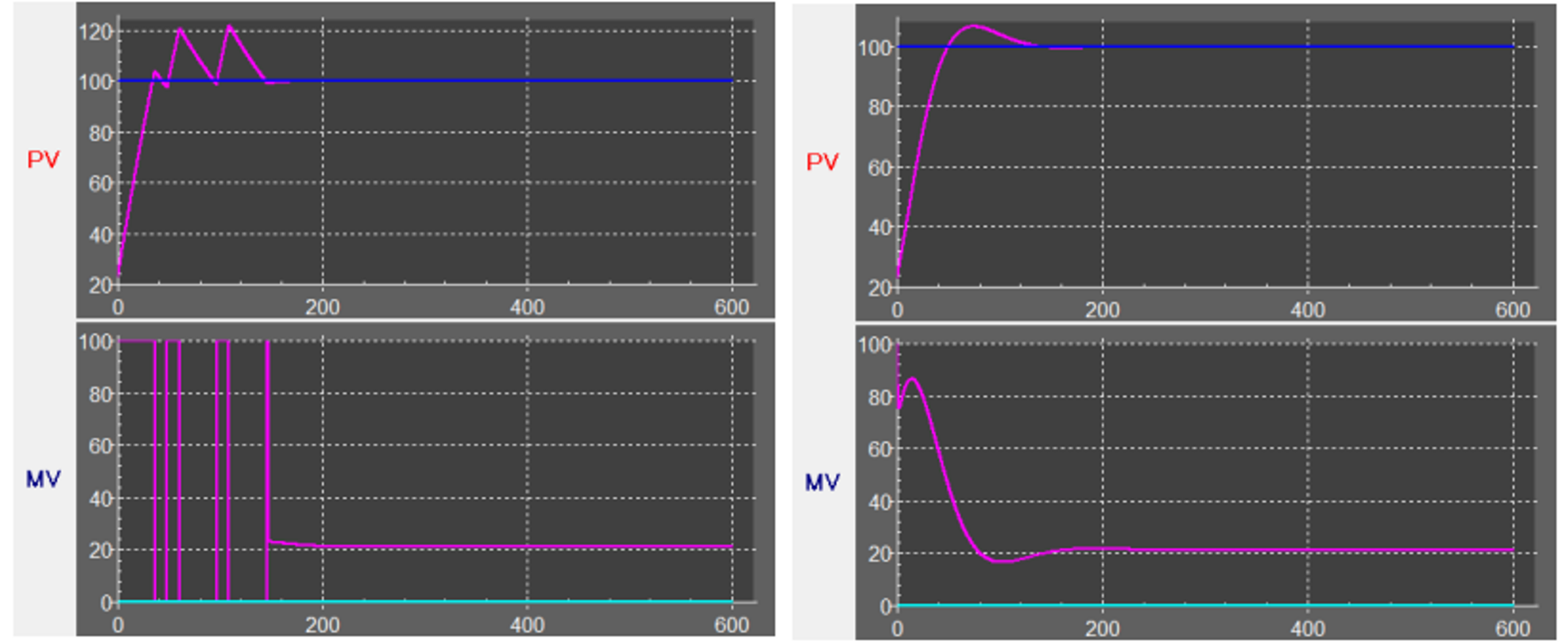 シミュレーション結果例 左側:オートチューニング 右側:PID制御