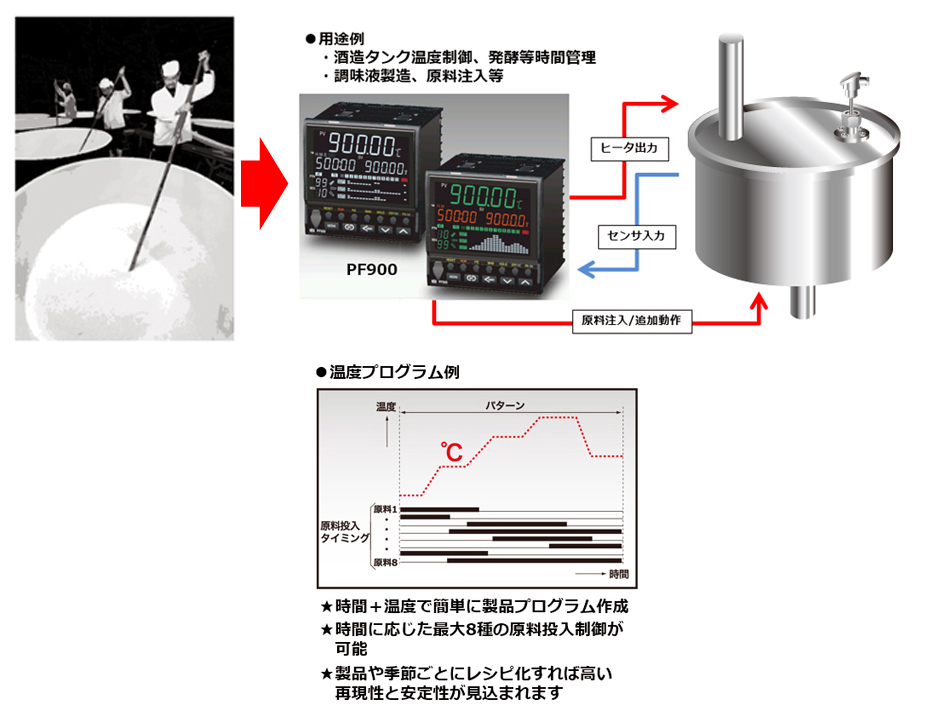 酒造タンクの温度管理(プログラム制御)、各種材料の投入タイミング(タイムシグナル出力)などを、材料の種類や季節ごとにレシピ化して自動制御を行います。