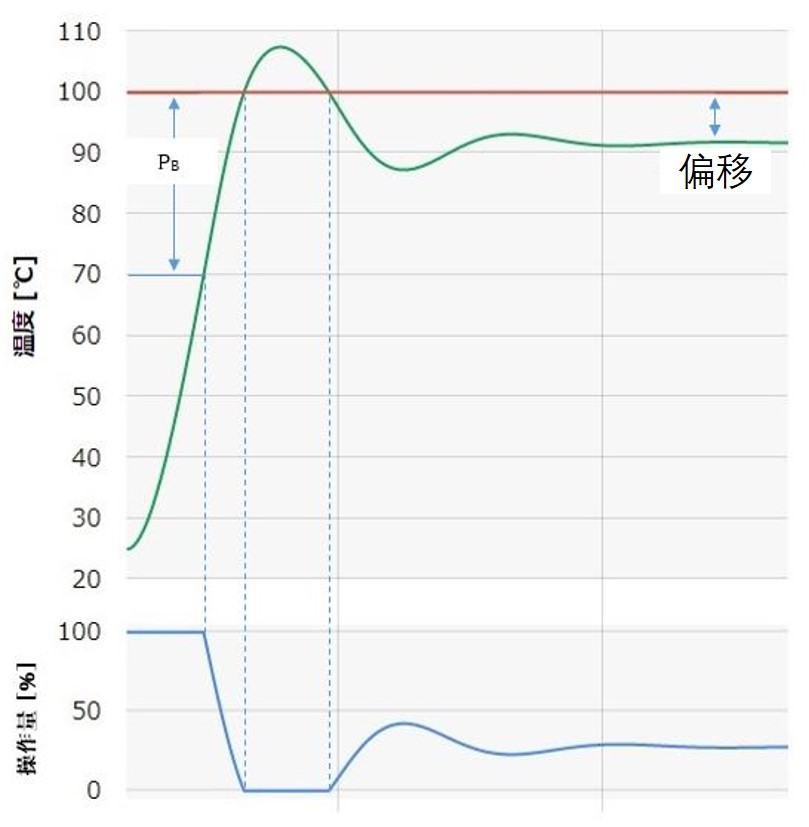 ① 初始时,假设PV为周围温度(25[℃]),则P动作输出=100%。