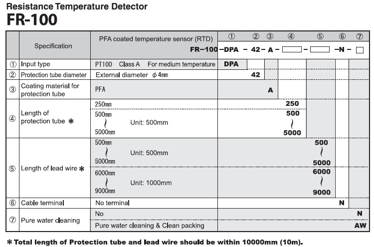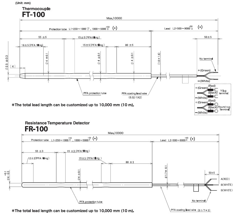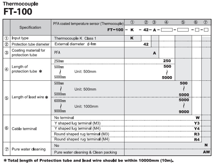 The total length (protection tube + lead wire) is limited to a maximum of 10,000 mm (10 m).