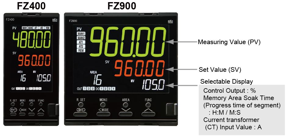 - Function of event inputs: RUN/STOP switching, AUTO/MAN switching, selecting Input 2, Interlock release, Peak/Bottom value release,