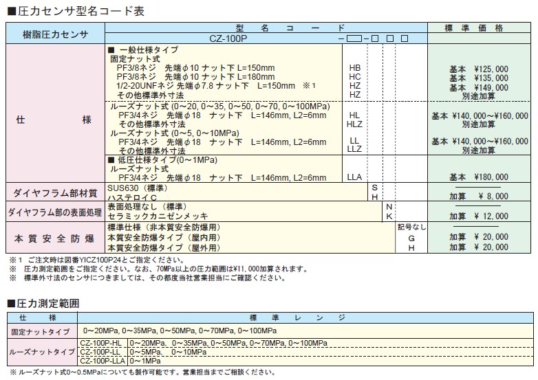 - レンジ(定格圧力):圧力レンジコード表(型式・価格)参照