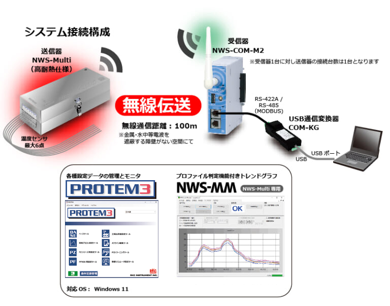 - 受信器:NWS-COMはRS-422A/RS-485(MODBUS)でパソコンやPLC等へ接続可能です。パソコンと接続して、各種設定データの管理とモニタおよび温度プロファイル判定が可能な各専⽤ソフトウェアを⽤意。(無料ダウンロード可能)