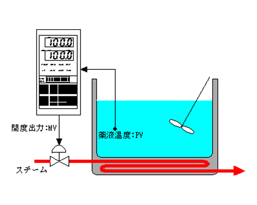 では、フィードバック制御において外乱による制御状態の乱れをどのようにして抑制しているのか、図1に示す温度調節計(温調計)を用いた薬液の温度制御を例に考えてみます。
