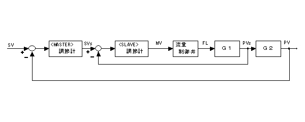図5に示しましたが、カスケード制御では制御ループが2重になっており、本来の目的である制御量(薬液温度)をフィードバックしているループを「マスターループ」もしくは「メジャーループ」、マスターループの内側に構成されるループを「スレーブループ」もしくは「マイナーループ」と呼んでいます。(図7)